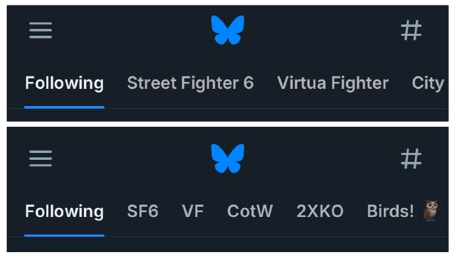 Short names are a huge boost to usability! The shorter the names, the less the user has to scroll to switch between feed views. I recommend every custom feed try to minimize how much space they take up on people’s valuable top bar real estate. The biggest downside I can think of is I think they show a bit worse in search results, but people only see that once – they have to deal with your superfluous Display Names every time they open Bluesky, so I think short names easily win out. Include the full name in your description and your feeds will still show up when people search for the full name.